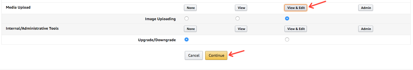 Step 4: Scroll to the bottom of the user permissions and click View & Edit on the Media Upload section, then click Continue